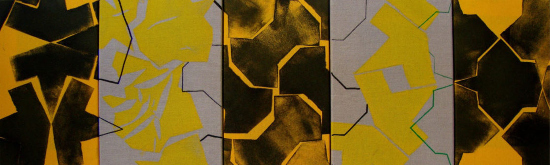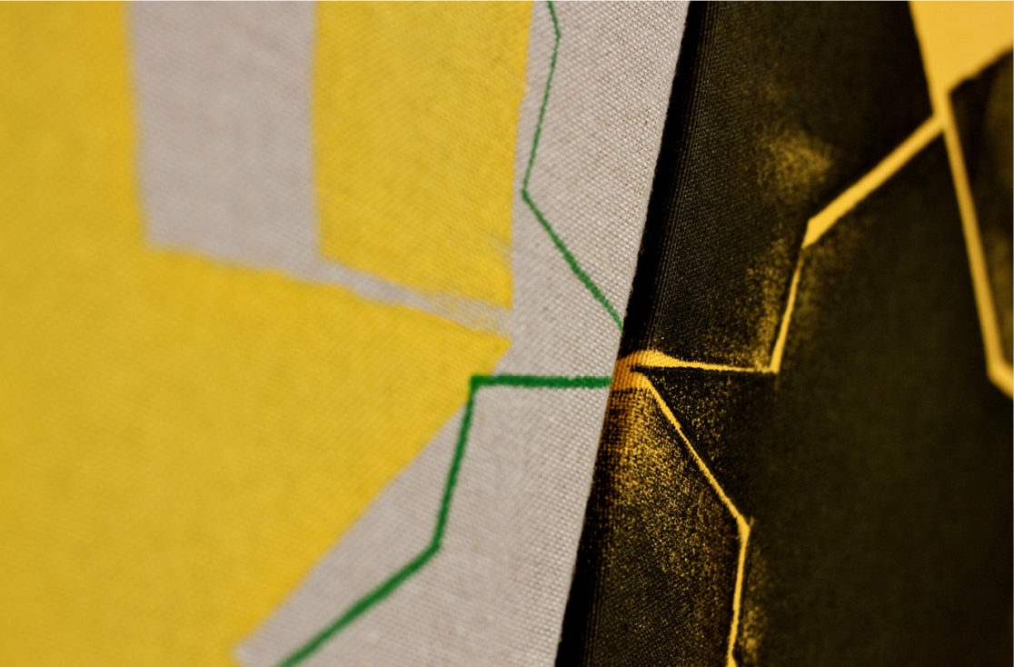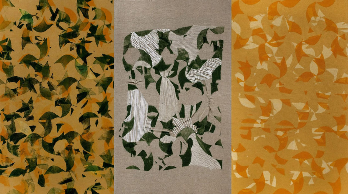 Estampación en bloque, rotulador e hilo sobre loneta color amarillo-ocre y gris