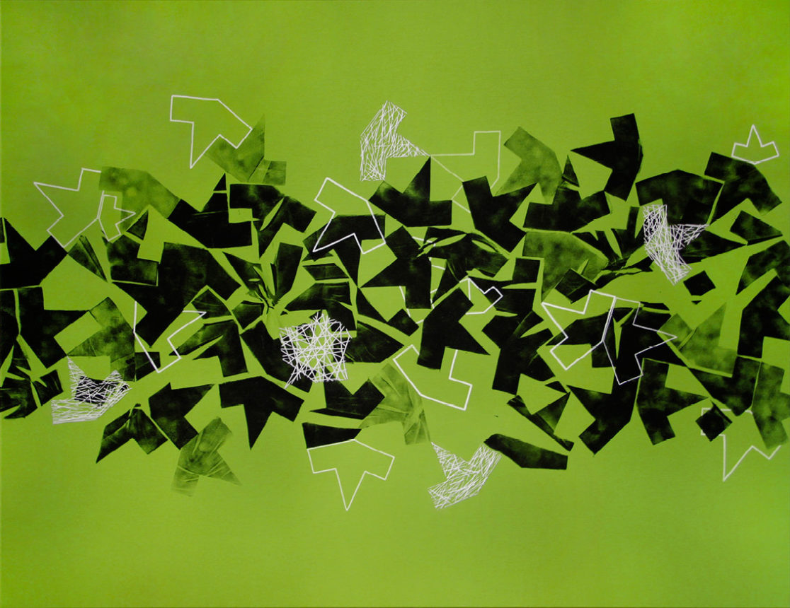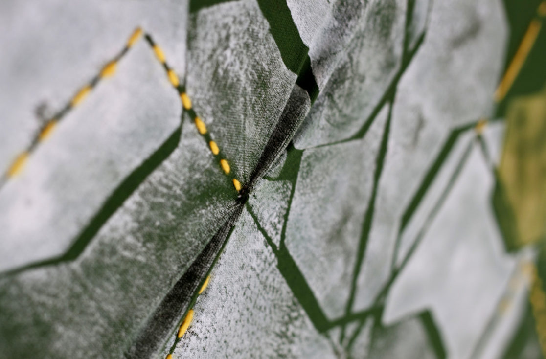 Estampación en bloque, rotulador e hilo sobre loneta color verde oscuro