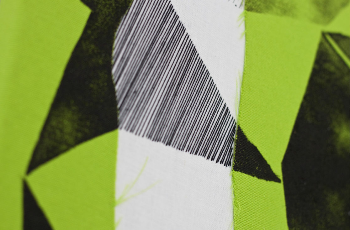 Estampación en bloque, rotulador e hilo sobre loneta color verde claro y poplín color blanco