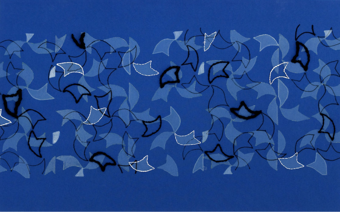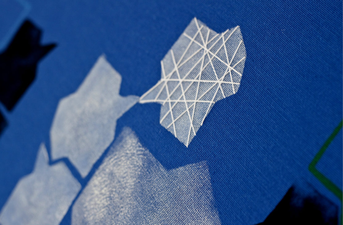 Estampación en bloque, rotulador e hilo sobre loneta color azul